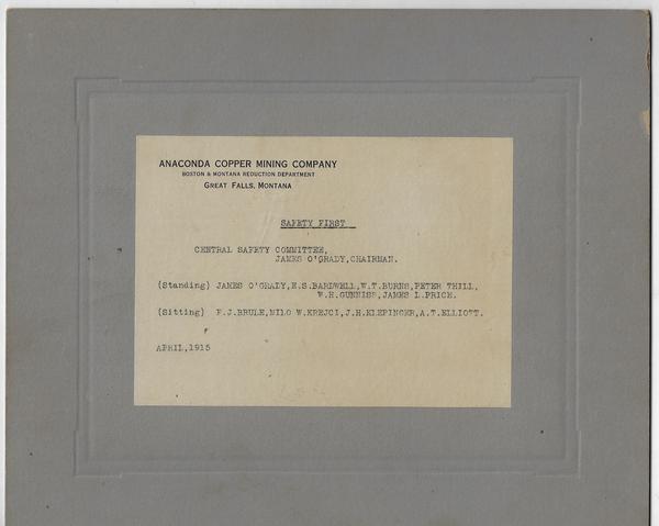 Mounted photo of the Central Safety Committee at the Anaconda Copper Mining Company in Great Falls, Montana. The photo is dated April 1915 on the verso. Typed on identifying Anaconda Copper Mining Company stationary and adhered to the verso, the men are identified as the Safety Committee James O’Grady, (chairman), E.S. Bardwell, W.T. Burns, Peter Thill, W.H. Gunniss, Jame L. Price, F.J. Brule, Milo W. Krejci, J.C. Klepinger and A. T. Elliott.
