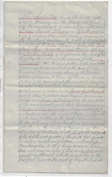 (Montana) Montana mining archive consisting of thirty-three items dating between the years of 1875-1920 with emphasis on the 1885-1895 period. The archive includes deeds, contracts, indentures and other legal documents. Mining around Butte and Helena, was the state's main economic business well into the 20th century. The Anaconda mine between 1892-1903 was the largest copper producing mine in the world, producing a total of more than $300 million worth of metal. Thus, it was paramount to gain and hold proper financial control and protection of the mining industry.