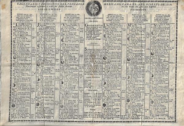 This impressive broadsheet, Calendario y Pronostico del Pensador Mexicano, para el Año Bisexto de 1816, is the first calendario that Lizardi issued. Both the recto and verso display the title printed at the top of the sheet and a central column flanked by three equal sized columns to its left and right. The text of the title is divided on each side of the sheet, recto and verso, by a circular monogram, that of Jesus Christ on the recto and of Mary, Lady of Guadalupe, on the verso. Below each of the two monograms is a short poem by Lizardi that does not appear elsewhere: the poem on the recto is titled “Decima a San Felipe de Jesus,” while that on the verso is “Decima a Maria Santisima de Guadalupe.” Each of the twelve flanking columns is devoted to a specific month and opens with a clever, four-line poem about the month.