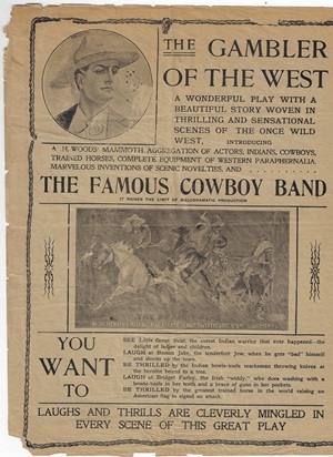 (MOVIE POSTER) Woods, A.H.; Davis, Owen. A.H. WOODS stupendous melodramatic production, THE GAMBLER OF THE WEST. N.P.: Privately printed, n.d. [ca 1905]. 4pp. theater herald, 11” x 14”. Featuring Indians, Cowboys, Trained Horses, Old-Time Stagecoach, Cowboy Band, Carloads of Scenery & Western Paraphernalia, A Big Company of Capable Actors and a Play That Possesses All the Best Elements of Entertainment. Poster style center spread with back panel as an outline of the plot synopsis and descriptive listing of the cast. The front cover is suitable for framing, with its old-style typography and outstanding drawing of four tough-looking cowboys losing at the card table to a good-